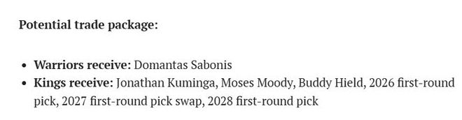 小萨博尼斯本赛季4230万美元的年薪,对已超工资帽的勇士而言,并非无法跨越的障碍。根据新劳资协议规则,超帽但未触及第一土豪线的球队,送出1000万美元合同可对应换回1750万美元薪资。勇士送出的筹码可以是库明加、穆迪、希尔德,外加2026 年首轮签、2027 年首轮签互换权、2028 年首轮签弥补。